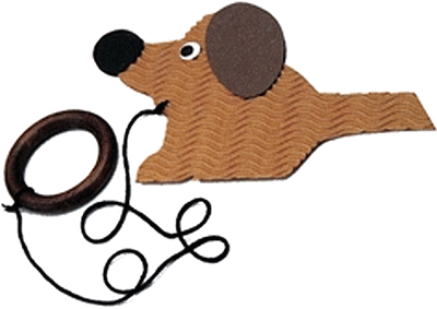 Materiali: Cerchi in legno per tende, cartone robusto, filo di lana robusto, pennarello nero, cartone o fogli di polistirolo marron per le orecchie, colla a caldo, fabuchi. 1) Su un cartone robusto disegnare il contorno del cane e poi tagliarlo. 2) Tagliare le orecchie dal cartoncino o dal polistirolo marron ed incollarle, con il pennarello dipingere il naso e gli occhi da una parte e dall'altra. 3) Praticare un foro al posto della bocca, farci passare il filo di lana lungo 50 cm e legarlo. 4) Legare l'estremità libera del filo di lana ad un cerchietto da tenda. 5) Il gioco consiste nel prendere il cane dalla coda, lasciar penzolare a corda e, con un colpetto verso l'alto, cercare di far entrare il cerchio nel naso del cane. |